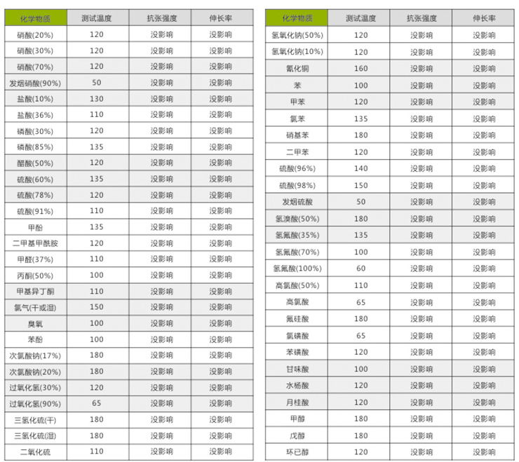 ETFE在各种化学物质的测试数据,测试条件是将试样在一定的温度下,浸泡在化学介质中30天的测试结果.试板得涂层厚度在1mm.