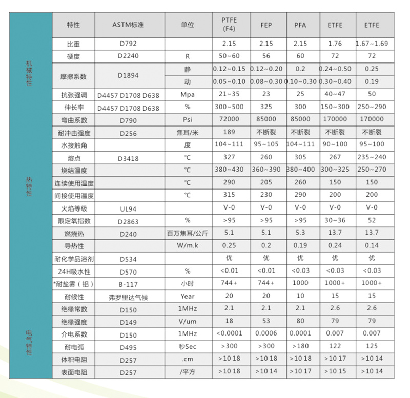 5、抗化学浸蚀性:氟树脂是一种结合力非常强的高分子,其应用于半导体通风管和化学工业的容器具有优异的防腐 性能和电绝缘性能;